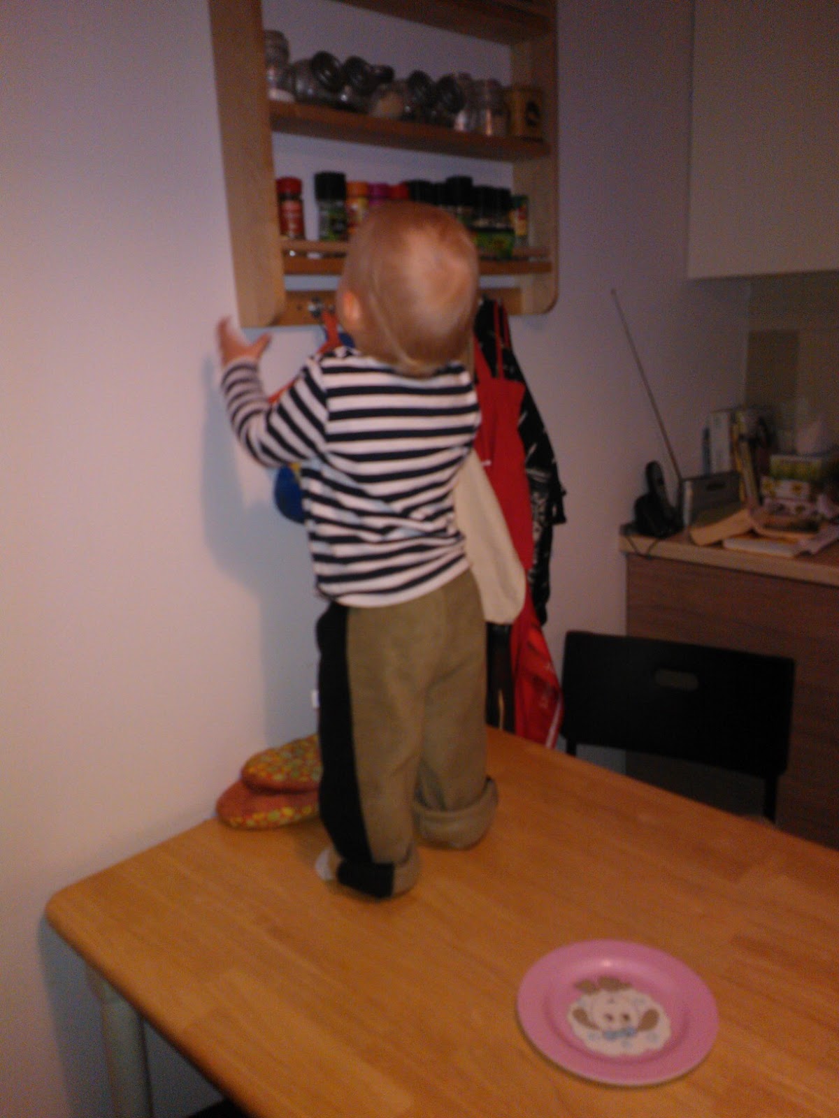 Najlepsze na koniec... Po krześle wspina się na stół kuchenny i jak po sznurku tupta prosto do półki z przyprawami. Usiłuje je powyrzucać na podłogę. Muszę zamykać drzwi do kuchni, ale kiedy Matju natyka się na zamknięte drzwi, wpada w ciężką depresję, kładzie się na podłodze i rozpaczliwie krzyczy.